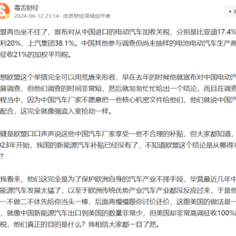 关键是欧盟口口声声说这些中国汽车厂家享受一些不合理的补贴,但大家都知道,从2023年开始,我国的新能源汽车补贴已经没有了,不知道欧盟这个结论是从哪得来的?
